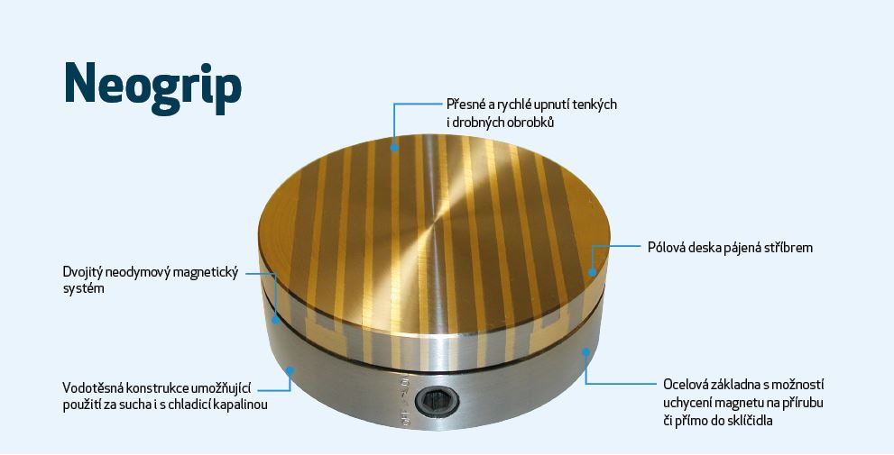 Permanentní magnetický kruhový upínač Neogrip je speciálně konstruovaný především pro upínání velmi tenkých a malých součástí, jako jsou drobné ploché obrobky, profily apod. Zvládne však také upnutí větších obrobků, a proto je univerzální pomůckou v každé průmyslové výrobě.